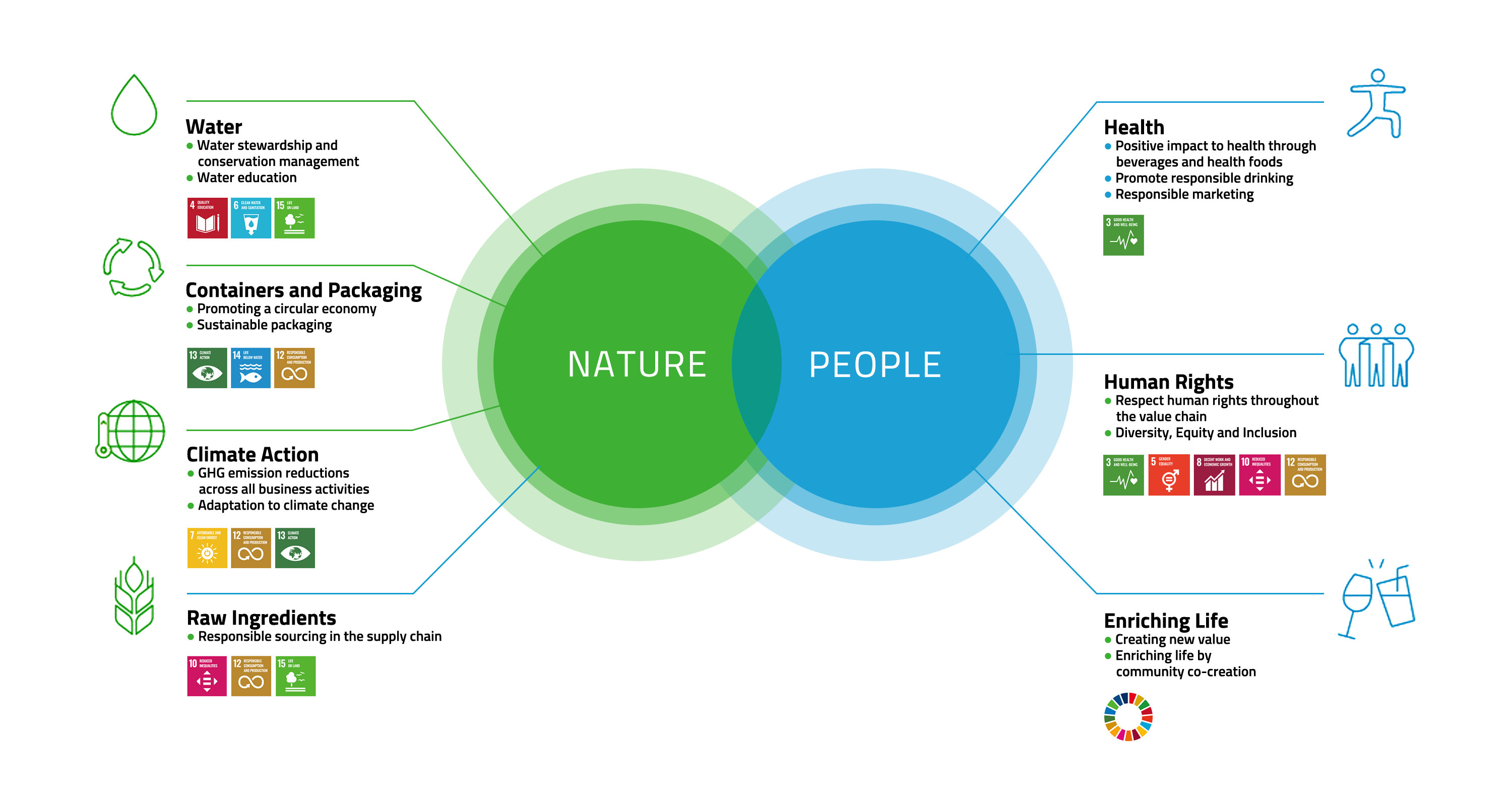 As a multifaceted beverage company, we are dedicated to realizing a sustainable society where enriching people’s lives and conserving the natural environment go hand in hand. We deeply respect the blessings of nature on which our products rely, and engage in a range of activities to ensure sustainable use of natural resources and a healthy natural water cycle. In addition to delivering products and services that enrich people’s lives, we strive to ensure that our business growth contributes to a sustainable society across our entire value chain.